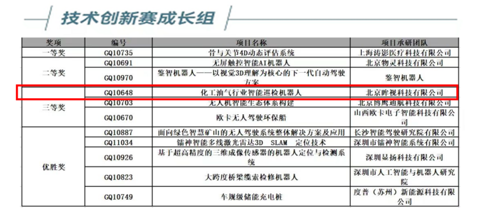 在本届技术创新成长组决赛中,相比较而言,本次决赛前三名分别授予了医疗领域AI、教育领域AI、消费者服务领域AI,而在“智能制造”工业AI与机器人技术创新领域、北京眸视科技一致被公认属于头部创新企业,在现场眸视公司展示了“化工油气智能巡检机器人”创新产品解决方案、产业生态合作以及十几家化工油气行业大客户商业实践案例等路演介绍、令评委专家和观众都耳目一新。