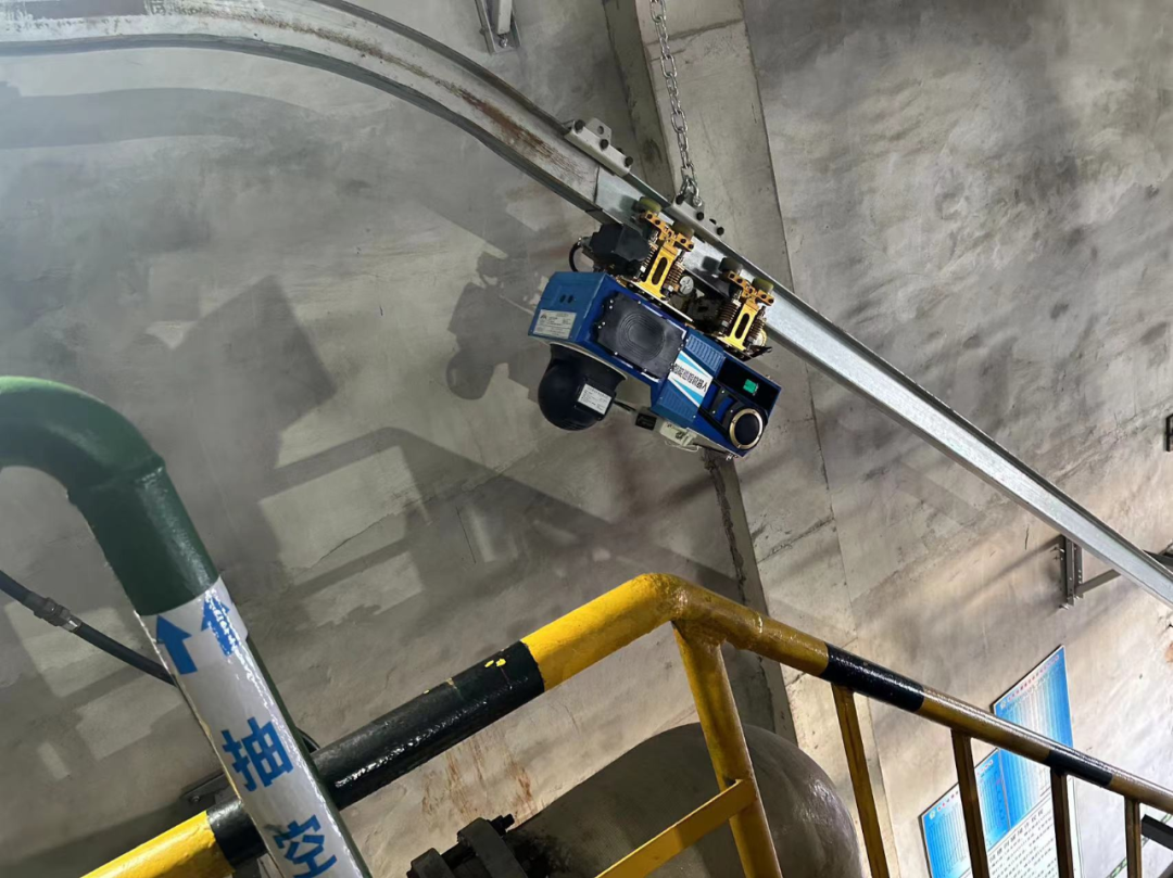 在液氯储罐区引入部署防爆挂轨巡检机器人,通过机器人先进的爬坡弯道技术成功实现了液氯库房上下两层的全面巡检,巡检一圈17-18分钟,主要巡检内容为读表,氯气检测,热红外测温等,还可以通过机身自带的气体传感器进行氯气有毒气体泄漏检测和含氧量检测。